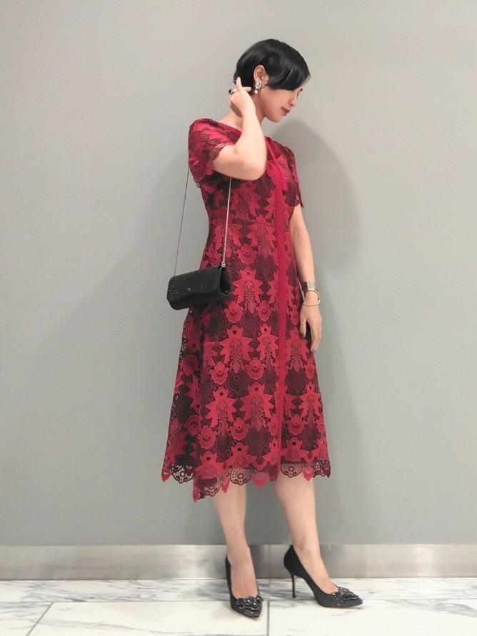 バッグがゴージャスな分、ドレスや足元はシンプルで◎その分アクセサリーはバッグに合わせて華やかに合わせてあげると、まとまったコーディネートが出来上がります。
