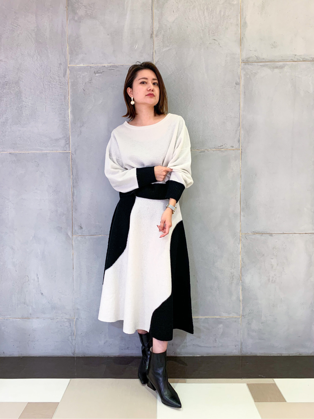 歩く時の華やかなシルエットに、落ち着いたモノトーンが大人の女性らしい、春の休日コーデです♪