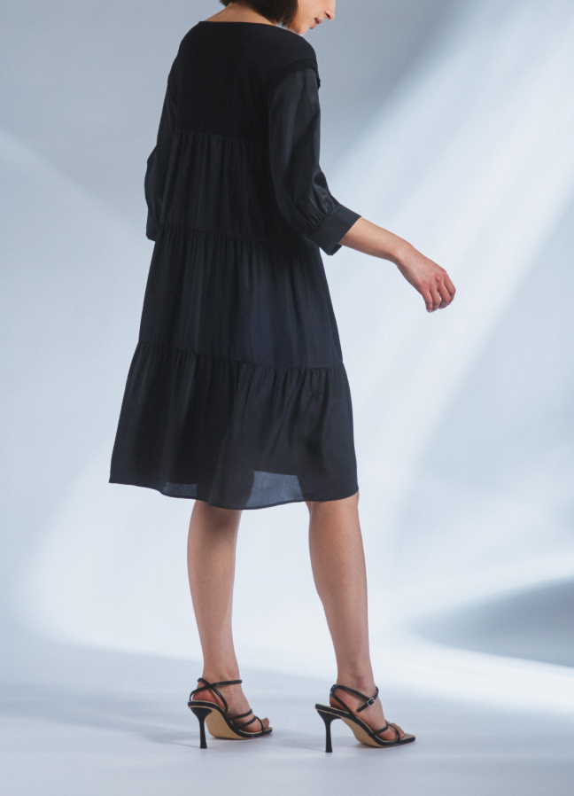 ニットと布帛がドッキングされ、さらにティアード加工が施された