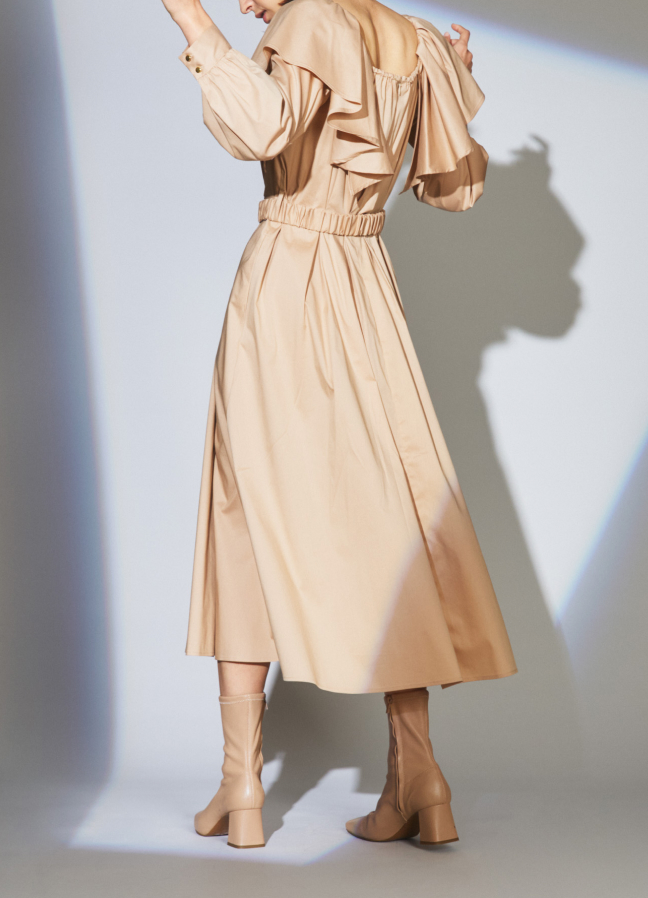 フリルのあしらいやティアードのディテールでグラマラスなムードを盛り上げて。ハリのある生地が弾力のあるによく馴染んでリッチさを醸すことができます。