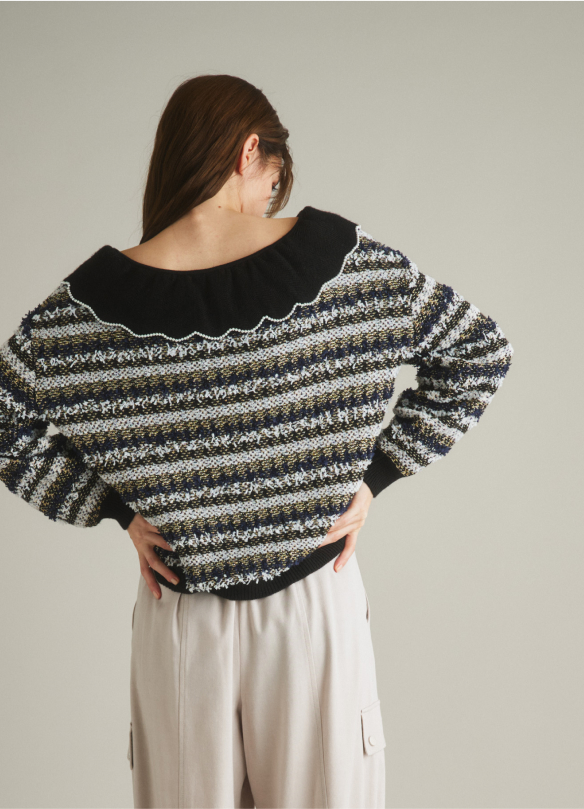 楽々着映えるラメ混のツイード素材を使用した、きちんとした佇まいのニットプルオーバー。インパクトのあるビッグカラーがアクセントになるので、シンプルなボトムス合わせでもコーディネートが様になるのが嬉しい。