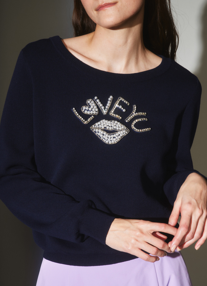 遊び心を感じさせてジャガード編みで程よく膨らみがある、ノーブルなネイビートップス。遠くからでも映えるビジュー刺繍が加わったことで大人の遊び心感じるキャッチーな見た目に。