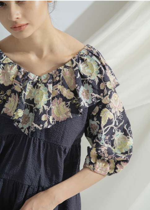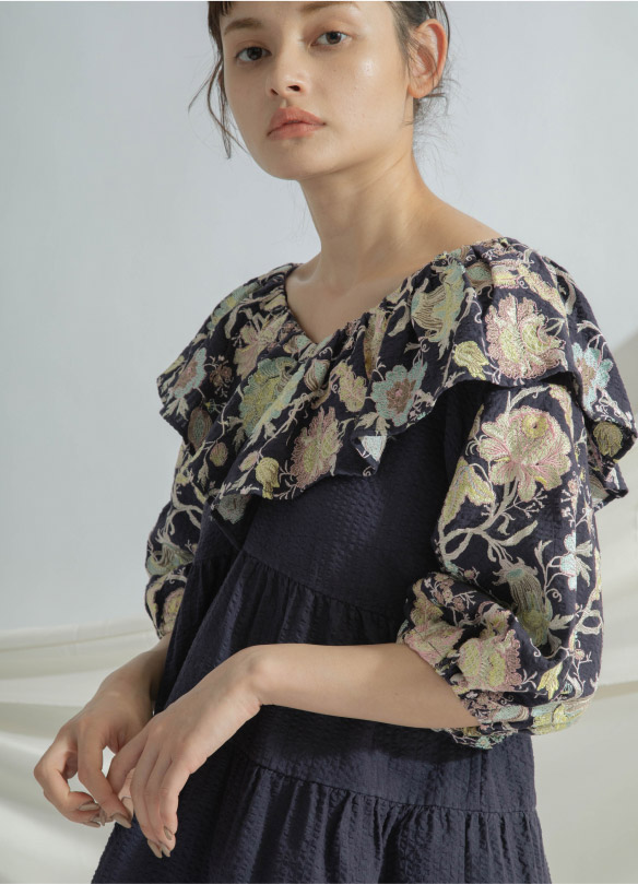 たっぷりと全身に刺繍が施されているので、まさに「一枚で絵になる」を叶えてくれる頼もしいアイテム。