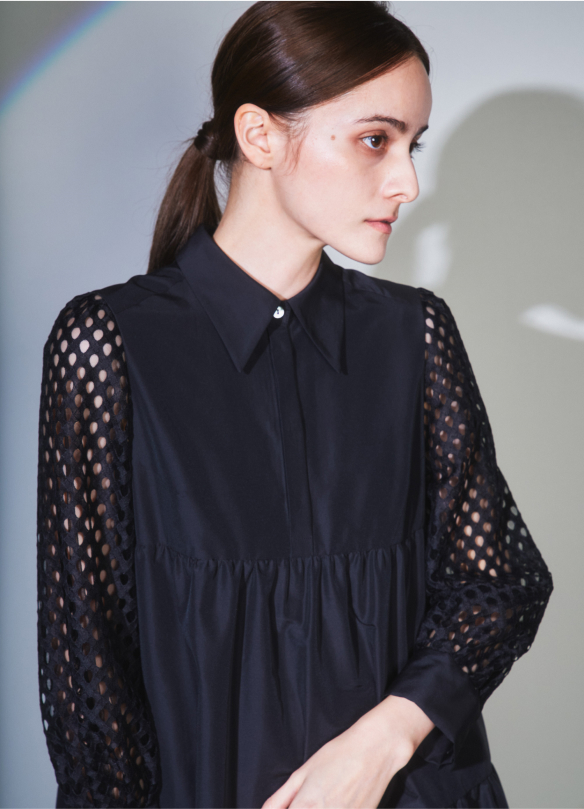 メッシュ袖がモードなアクセントを添える端正なティアードワンピースは、お呼ばれにもぴったり。絶妙な膝下丈が抜け感もクリアするのでこなれた見た目へ誘導することができます。