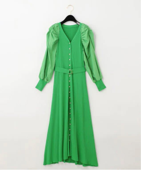 発色の良いグリーンが新鮮なニットワンピース。お袖のシャーリングと程よいデコルテの空きが、肩周りを女性らしく華奢に見せてくれます。下のボタンを開けて柔らかい素材のスカートをレイヤードするのもおすすめ。